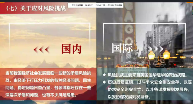 童老师首先跟各位学员介绍了党的二十大的主题,之后,童老师简述了“三个务必”的内容,帮助同学们深刻学习其深刻精神内涵,同时带大家深入学习了党的二十大的新观点,并从党的二十大的主题、关于过去5年的工作和新时代10年的伟大变革两个方面回顾了十九大以来党和国家取得的举世瞩目的重大成就和应对的风险挑战,阐述了关于团结奋斗的时代要求。
