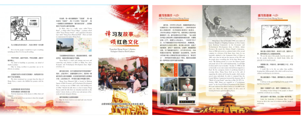 继6月29日外国语学院教工二支部全体党员参观学习了盛习友纪念馆并开展了情景式党课学习之后,支部成员利用自身专业优势,翻译习友英雄事迹并制作成宣传活页,为红色文化对外传播尽心尽力。历经数月,教工二支部全体党员心往一处想、劲往一处使,深入探讨学习盛习友烈士的事迹与精神,收集整理了馆内介绍语的文本素材,确定翻译对象及英译内容;明确翻译任务分工和职责,对介绍语及盛习友相关红色故事进行英译、校正、整理;并对英译结果进行遴选与设计,印制双语宣传活页,深入高校课堂及社区开展用英文讲好习友故事的相关活动,进行红色文化的对外传播。