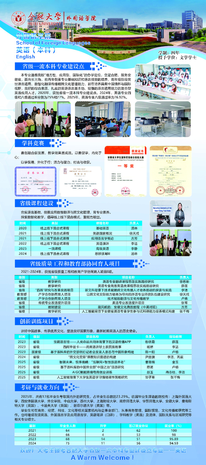 省级“一流本科专业建设点”专业。本专业打造分层次的集中实践和课内实践教学体系,开拓应用能力的课内外输出路径,提升学生讲好中国故事、安徽外宣话语的写作、演讲、翻译和阐释能力。毕业生具有较好的信息技术、思辩能力、创新创业意识,较高的应用翻译能力和跨文化传播能力,具备翻译和比较文学与跨文化学科知识与能力。