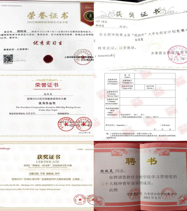 立身以立学为先,立学以读书为本。倘若没有自律和刻苦的学习,想要在其他方面发光发热便也成了空谈。宝剑锋从磨砺出,梅花香自苦寒来。在平时的学习中,殷牧岚就以高标准严格要求自己,高效完成老师布置的学习任务,养成了良好的学习习惯。人所实践之目标,是其锐志,是其上进与希望。入学伊始,殷牧岚就为自己规划了清晰的未来,并制定计划不断前行。在校期间,她凭借自身的努力获得了校级一等奖学金和三等奖学金、外研社杯阅读比赛一等奖、外研社写作三等奖等众多奖项,并以此为动力,坚持“听不懂的文章反复磨练,学不懂的知识往深处钻研”,乐思笃学,行而致远。