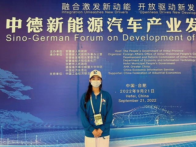 奋斗是青春最亮丽的底色,行动是青年最有效的磨砺。有责任有担当,青春才会发光。为了将理论运用到实际,提高专业素养,殷牧岚参加了“语言大白·皖美译心”志愿活动,疫情期间线上为在皖外国友人提供翻译和答疑服务。这不仅锻炼了她的外语沟通能力,而且拉近了中外人文交流距离,为促进中外文化交流、展现中国风采贡献了一份力量。2021年,殷牧岚还积极报名参加世界制造业大会志愿者,虽遗憾落选,但她并未气馁。经过一年的努力,她成功入选,并担任了2022年世界制造业大会翻译志愿团体领队。大会对外语翻译志愿者要求极高,作为领队,殷牧岚责任重大,既要做好自身的志愿服务工作,又要协调管理好志愿者。面对层层压力,殷牧岚迎难而上,最终凭借优异的服务和管理协调能力于同年得市级优秀志愿者嘉奖,给同学们树立了良好的榜样。而这次社会实践带给她的不止是荣誉和掌声,还有难能可贵的人生经验。在服务过程中,她不仅学会了严谨细致、三思而行,还学会了耐心沟通、注重协作。在作为合肥学院志愿者代表接受媒体采访时,她提到:奉献自己的快乐是其它快乐无法比拟的。也是在如此脚踏实地的体悟中,她领会到知止有定,笃信而行,为绘制独属于她的斑斓青春,实现中华民族伟大复兴梦,唯有坚定强大信念,行稳致远,方能始终。