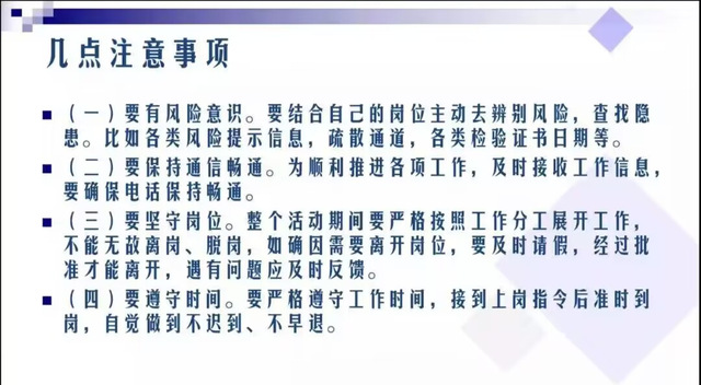 本次培训共计三项议程。前两个阶段,主讲人围绕消防安全和应急安全提醒志愿者们要有消防风险意识,随时保持通信畅通,以便应对突发情况。最后一项会议内容是外事培训。关于外事培训,主讲人首先强调“八个原则”,要求志愿者们立足正确的政治立场,怀揣饱满的热情,储备专业知识,提前做好服务规划,礼貌得体地进行沟通交流。除此以外,主讲人强调志愿者们需提前熟悉相关背景资料,以便更好为外宾提供服务。