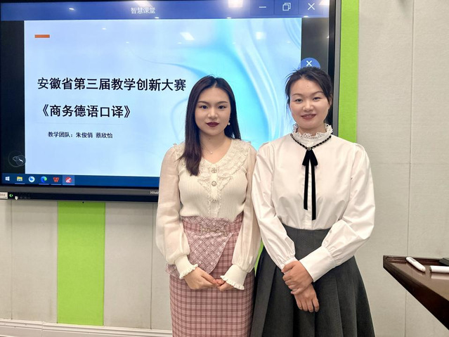 2023年4月,外国语学院德语专业朱俊俏、蔡欣怡团队在安徽省第三届教学创新大赛中脱颖而出,所授《商务德语口译》课程荣获新文科组中级及以下组省级二等奖。