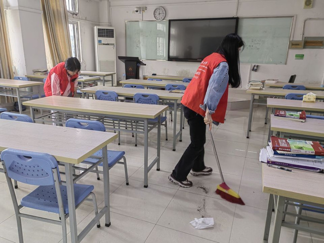 活动当日的中午12点,志愿者们换上统一的工作服,手握着扫把、拖把等清扫工具,每个人都充满着活力和热情。在志服团负责人的安排协调下,志愿者们分成数个小组,有序地进入各个教室,开始了自己的清扫工作。