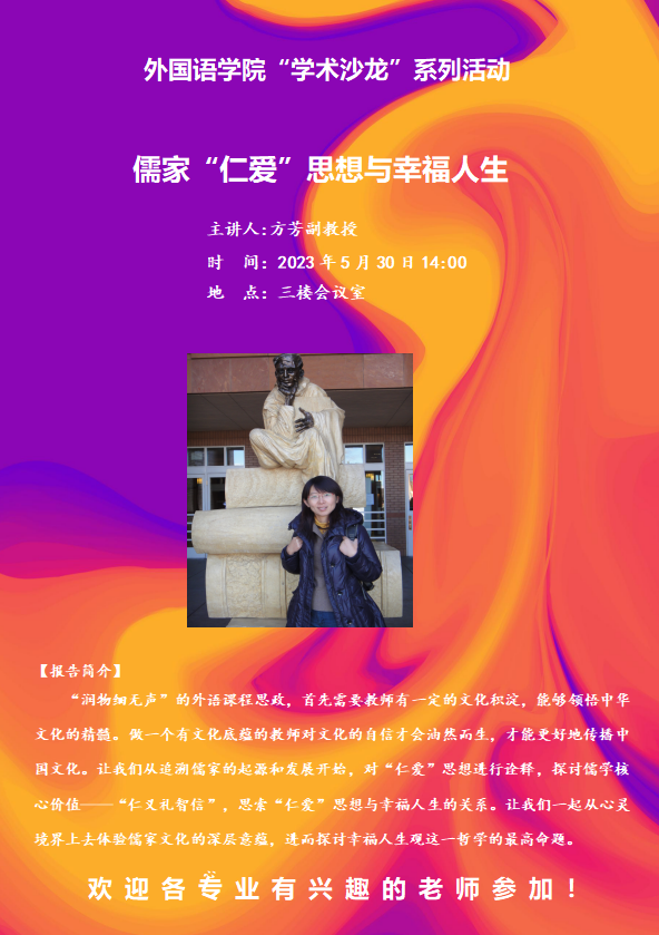 5月30日下午,外国语学院学术委员会主任方芳老师开展“儒家‘仁爱’思想与幸福人生”学术分享活动。本次活动由院党委副书记吴孔宝主持,李洁副院长出席,英、德、日、韩四个专业多名教师参加。