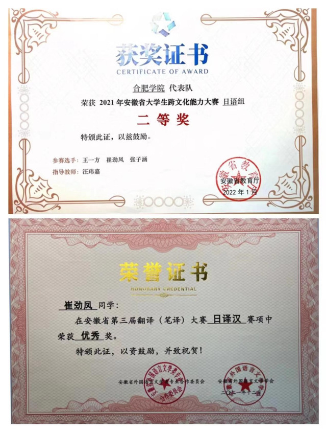崔劲凤在班级里成绩一直名列前茅,在自己努力学习的同时,也耐心帮助同学解决学习上的困难。她在完成学习任务之余,也积极参加各种比赛:在2021年安徽省大学生跨文化大赛中获得二等奖,在安徽省第三届翻译大赛获得优秀奖。大海凭鱼跃,天高任鸟飞。新时代的中国为青年提供了广阔的海域与浩瀚的苍穹,青年自身应有徜徉于天地的觉悟,展现出不惧路远的志向。