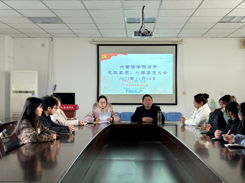 2023年11月30日中午12:00,外国语学院在三楼会议室召开了思政委员、心理委员大会。本次会议出席的老师有外国语学院党委书记吴孔宝,团委老师张正华与王雨濛。大会旨在加强学院学生思政教育和心理健康教育。