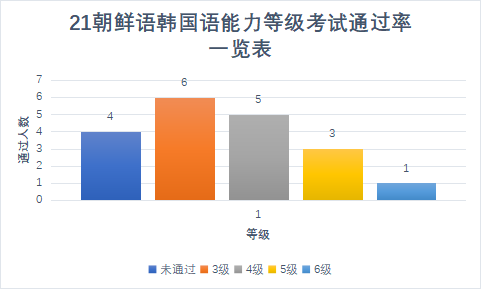 中高级别中另有三人通过5级,五人通过4级,六人通过3级。总通过率78%。这是朝鲜语专业学生首次参加重量级的韩国语能力等级考试,取得如此优秀成绩,再次凸显了我校朝鲜语老师们专业教学水平。