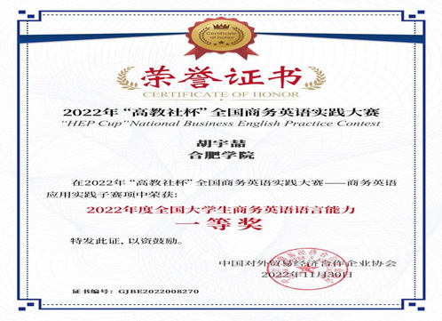 胡宇喆同学在过去的学年里,表现出了高涨的学术热情和严谨的学习态度。积极参与各类学术竞赛项目,不断探索新的个人提升领域,脱离自己的舒适区,且取得了显著的成果。其中包括2022年“高教社杯”全国商务英语实践大赛子赛一等奖、党的二十大报告翻译大赛一等奖、2022年“讯飞杯”全国高校英语口语大赛安徽赛区一等奖2023全国大学生英语竞赛B类二等奖、国家励志奖学金和特等奖学金等等。此外,还积极参与社会服务,2023年“中国航天日”志愿活动中服务30个小时,不仅培养了她为他人服务的责任心,也为社区服务做出了积极的贡献。