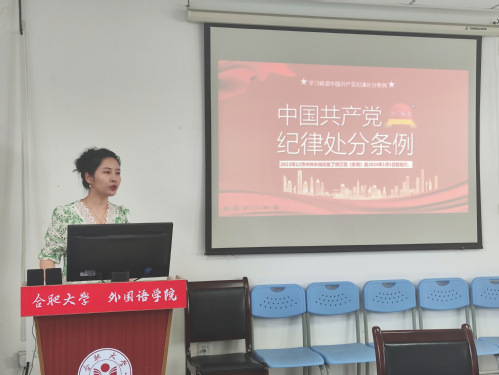 根据学院党纪学习教育计划安排,6月12日,外国语学院学生第一党支部书记李菲菲,以“学习解读中国共产党纪律处分条例”为主题,为支部全体党员上了一次专题党课。