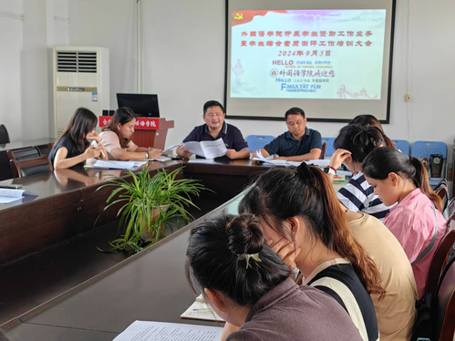 9月5日中午12,外国语学院于三楼会议室召开了学生学生综合素质测评资助工作培训会议。外国语学院学工办主任李发俊主持会议,党委书记吴孔宝、辅导员张正华、王雨濛及各班班长、团支书参加了会议。