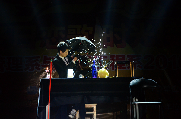 冬日恋歌 时光接力 一场热情奔放的舞蹈串烧首先拉开了晚会的大帷幕,将现场观众的激情瞬间点燃。接着,光影秀《光影菁华》巧妙地利用光与影为观众带来了极大的视觉震撼。紧接着,搞怪雷人的小品表演《甄嬛后传》一开场便引得全场观众捧腹大笑,全场热情也被推向一个新的高潮。随后,颇具特色的哑剧表演《大学生变形记》以一场无声的表演展现出了胜似有声的舞台魅力,引得全场爆发出雷鸣般的掌声。其他的节目也异彩纷呈,小品《我有一个梦想》展现了语言的幽默;《Fashion Gymnastics》等舞蹈创意与实力并存;黄梅戏《天女散花》唱腔温婉、舞姿优雅。最后,晚会在深情的大合唱中完美落幕。