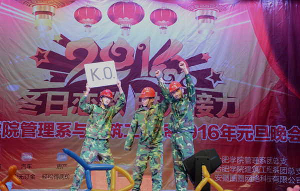 2015的尾巴尚未到达,新年的气息已悄然而至。12月11日、12日,由校中国语言文学系主办,中文系团总支学生会承办的元旦联欢晚会和管理系团总支、建筑工程系团总支联合主办,安徽圈圈网络科技有限公司协办的2016年合肥学院管理系与建筑工程系元旦晚会相继在一区致用礼堂举行。全校近千名师生到场观看,全场座无虚席。 飞扬中国梦 中文最青春 晚会在激情四射、动感十足的双人舞蹈《Dangerous》中拉开帷幕,六盏聚光灯汇聚舞台中央,悠扬浓厚的萨克斯配合不老经典《我心永恒》瞬间唤醒了观众的双耳。随后,孔津京凭借其超高的音准,以一首《死了都要爱》带动全场氛围,声嘶力竭的喊叫响彻礼堂,现场观众不觉为之震惊。紧接着,中文系老师王玉琴独唱《绒花》,粉色长袍下的歌喉更加温婉动人。朗诵表演《朱子家训》,在回顾千年前朱子谆谆教诲的同时,也让观众深深地沉浸在博大精深的国学思想中。古琴曲《梅花三弄》,传神的演绎尽显中文学子的风采。小品表演《倩女幽魂》,利用反串形象成功地突破了经典的塑造,传统故事的现代演绎令观众眼前一亮,一度将现场气氛推向高潮,引得全场爆笑,掌声雷动。此外,激情洋溢的B-BOX、性感帅气的现代舞《IT’ ME》也让现场观众尖叫连连,掌声不断。最终,晚会在一曲古典舞《玉生烟》的优美舞姿中圆满落下帷幕。中文系党总支书记朱涛还以一幅对联,“校风系风班风学风考风教风,风气纯正,风尚高雅;勇气志气才气正气喜气和气,气象万千,气魄宏伟”对此次晚会给予了衷心的祝愿和美好的希冀。