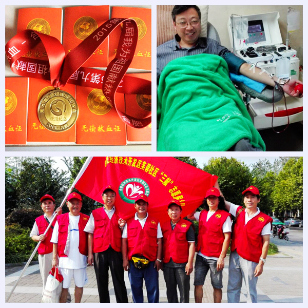 在我们采访时,姜老师和我们谈起“三献”志愿服务队队长许江安(合肥市第一个全国无偿献血志愿服务终身荣誉奖获得者)是一个很值得敬佩的榜样,无偿献血140多次,获得过金、银、铜奖。他是一名普通的保安,收入不高却经常到献血站做志愿服务,很多人对“三献”最先解除疑虑的就是因为他。其实,他的榜样也折射出他的人生, 从那一枚“第九届我为祖国献热血”登顶纪念的章里,我们也看到了姜老师的人生态度:奉献与坚持。