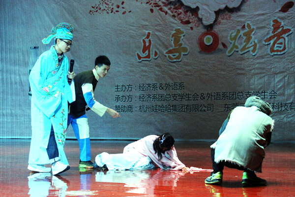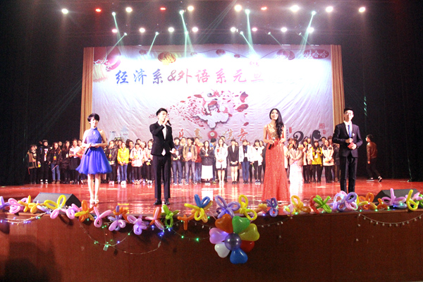 伴着电音强劲的节奏,踩着整齐的舞步,热情如火的街舞翻开晚会的扉页。4位青春靓丽的主持人一亮相便收获全场掌声。接着,经济系的同学表演了一出令人捧腹的小品《唐伯虎点秋香》,极具创意的剧情,演员们夸张的动作表情,一唱三叹的对白,引得台下观众爆发出一阵又一阵的大笑。柔美的英文、动感的德文、温情的日文、动听的韩文, 新颖独特的四国歌曲串烧点燃现场热情的气氛,口哨声、掌声接连不断。舞蹈《咏春》中,舞蹈演员们一袭清雅的旗袍装束,手中摇曳的纸扇伴随着升腾的烟雾,用轻盈的步伐、柔软的肢腰蹁跹起舞,将观众带入如梦如醉的画卷,博得满堂喝彩。当晚更是有几位教师的热情献艺。经济系老师邓秋实一首独唱《酒醉的探戈》活力四射,以及公共体育教学部老师刘梁玉献上的一场精彩绝伦的拉丁舞《默》,柔软的身姿、极具张力的舞蹈,收获了观众的热烈掌声。在聆听了诚挚温情的朗诵《爱在合院》后,晚会圆满结束。