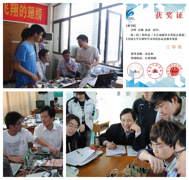 说起自己学生的成绩,高先和便滔滔不绝,没有什么比看到学生们在一次次竞赛中斩金夺银更加骄傲自豪的事。2009、2013年获得全国大学生电子竞赛一等奖,省内一等奖占比排在前列。在这些作品中,不乏被新华网、新安晚报等多家媒体争相报导的智能创新成果,如“硬币清点系统”利用传感器技术、根据硬币的材料不同判断其真假并进行分类,降低了许多假币损失,为公交车和银行省了不少麻烦,有很好的市场前景。“智能超市”使结账只需要几秒钟;“聪明座椅”让学生彻底告别早起占座。如今,高先和将团队工作室搬到同学们的研究地,让同学们参与产品设计的全过程,熟悉研发的必要科学环境。2013级电子信息工程系电协会长汪程同学表示,老师们的项目经验让自己在参加学科竞赛少走了不少弯路。因为高老师白天有教学任务,所以经常凌晨三点多,这里还是灯火通明,师生们还在互相交流、修改完善项目。 成功,需要克难攻坚的科研精神,也需要执着追求的教育情怀。产学研之路漫漫,越过山丘,才会发现远方还有更多的山峦,对于现代电子控制与检测协同创新中心来说,未来的路还很长,如何将中心做大做强?如何围绕科学前沿和地方经济社会发展的重大需求,开展关键技术及重点产品的技术攻关和成果转化?如何实现“地方急需、省内一流”的目标定位?高先和透露,目前正在积极申报省级工程技术中心和教育部“应用技术协同创新中心”,团队坚信只要一直在路上,总能不断攀上新高度、看到新风景。 (宣传部 电子系 科技处 潇潇 学生记者杨欢 姚建立) |
