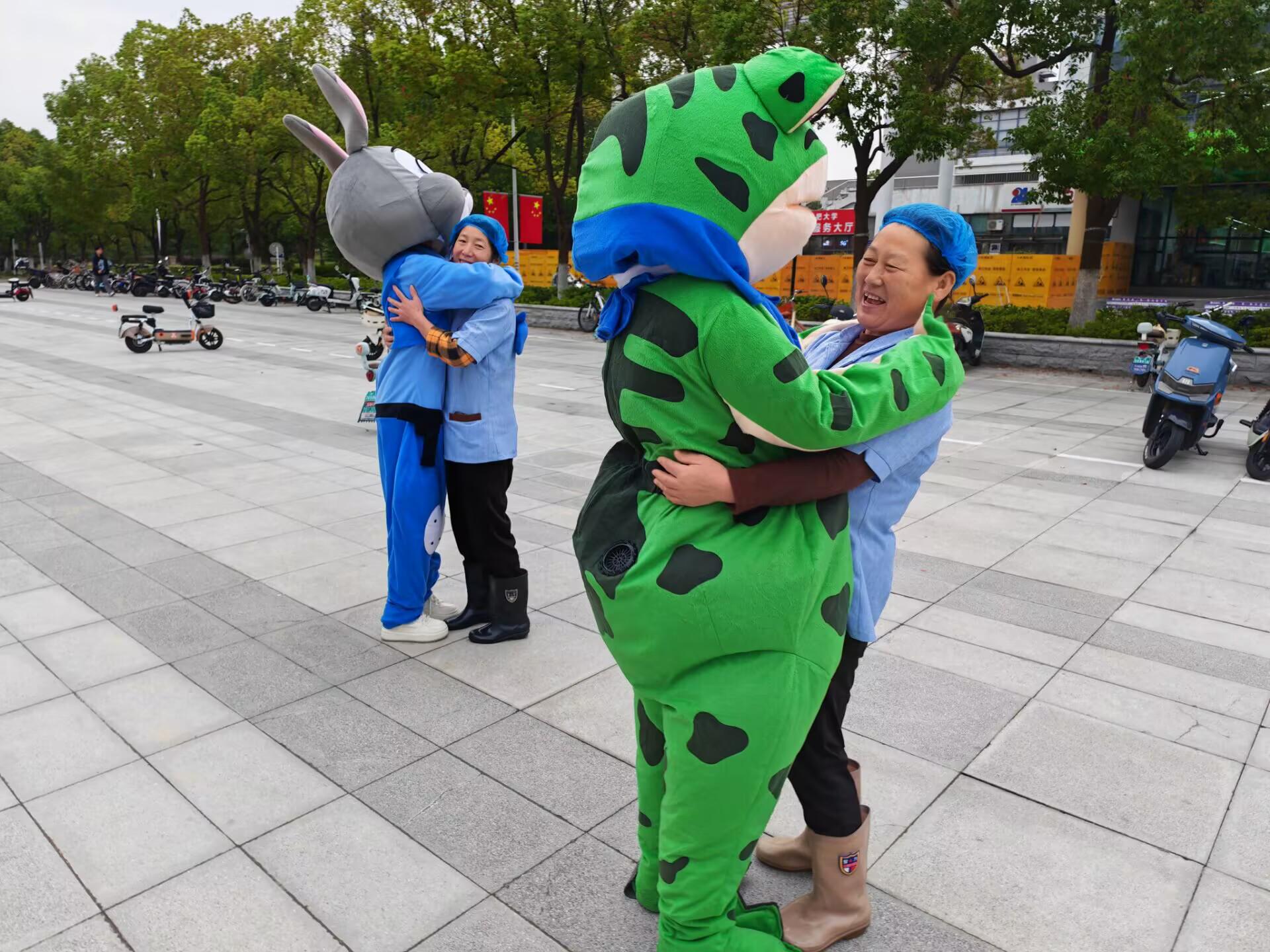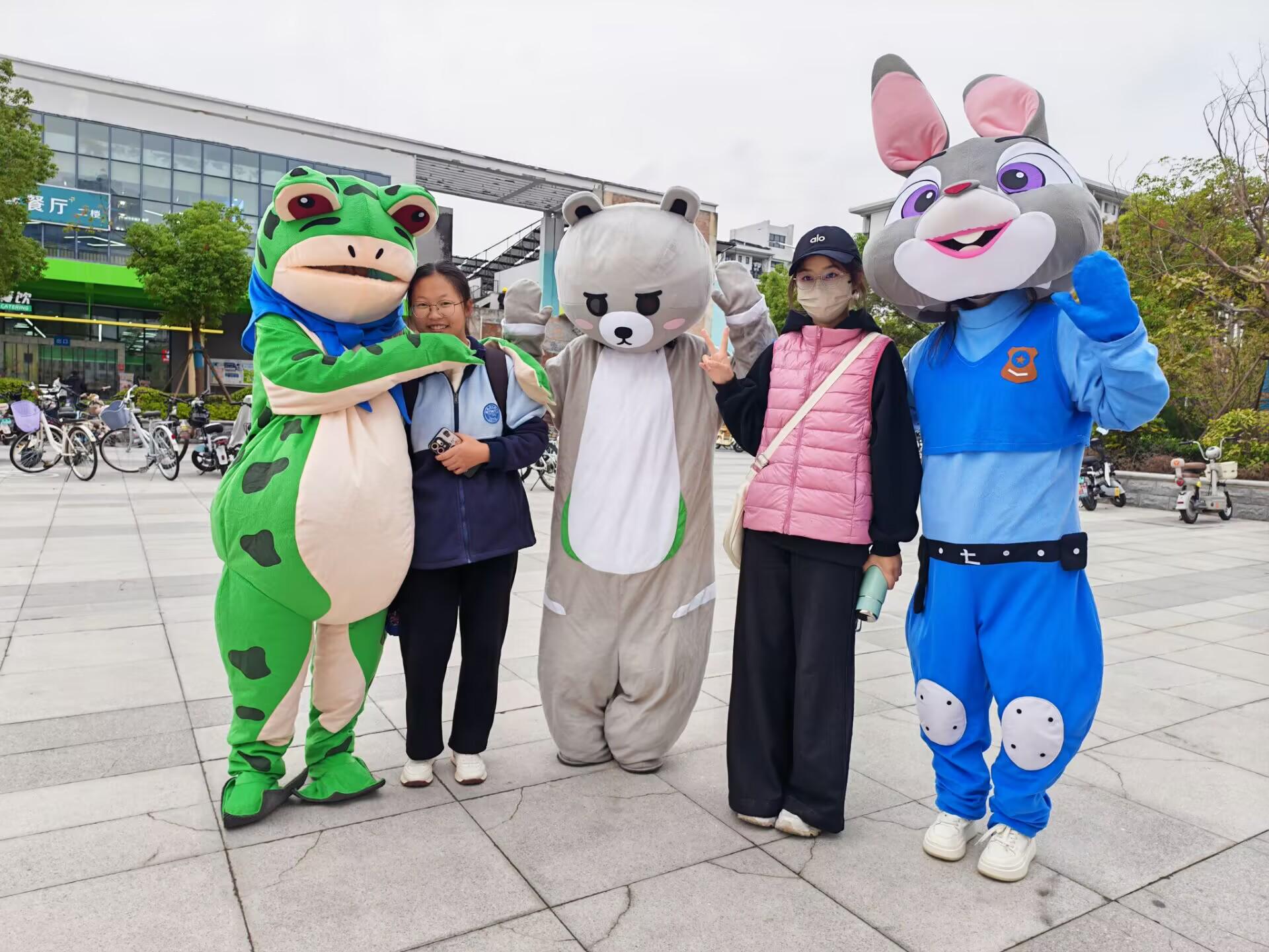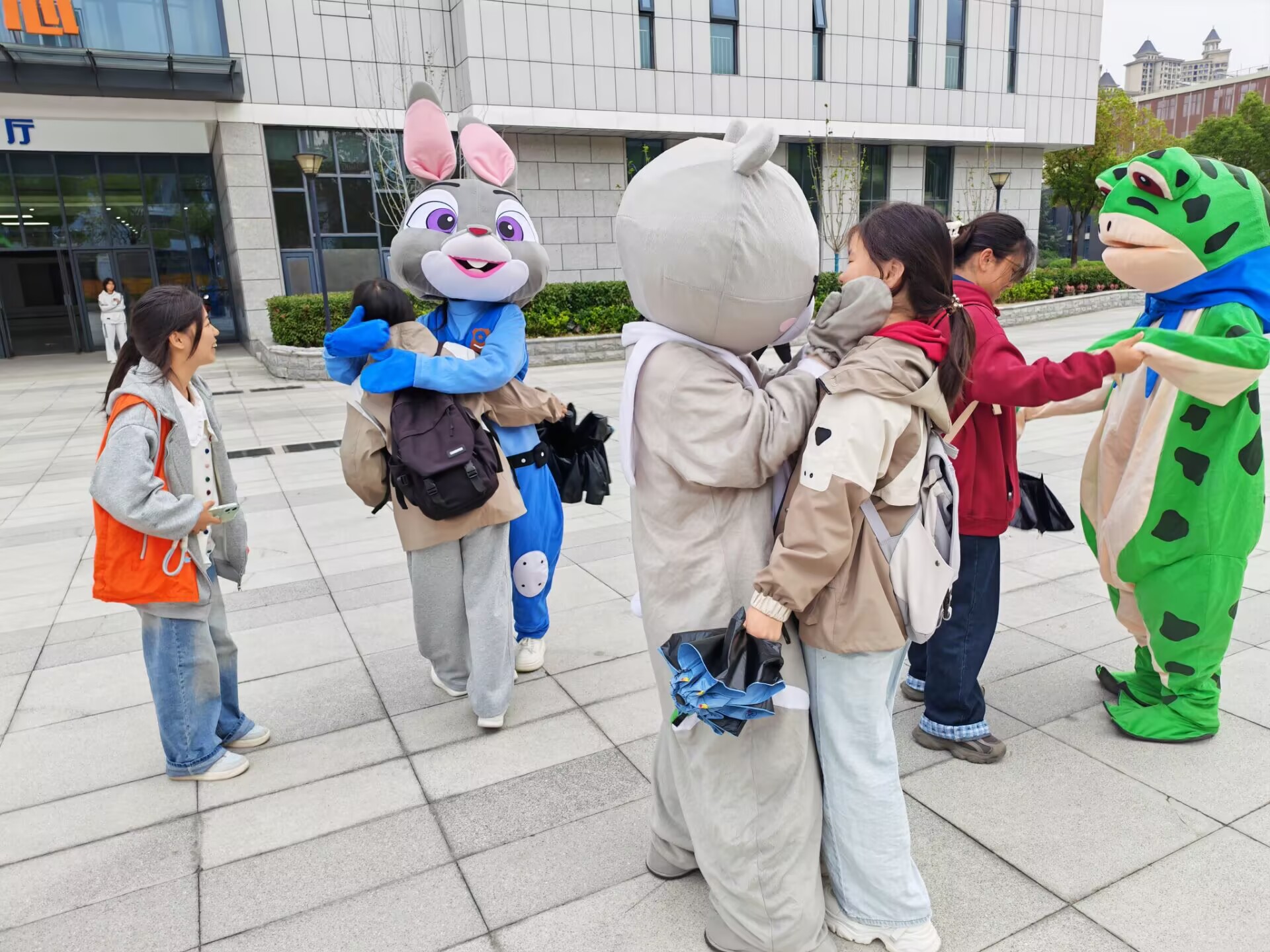 活动现场2名志愿者负责引导队伍并准备了定制小礼品。4名身着可爱玩偶服的志愿者早早到位,憨态可掬的造型刚一亮相便吸引了过往同学的目光。他们主动张开双臂,为大家送上治愈拥抱,配合拍照,用肢体语言传递关怀温暖的氛围吸引同学老师驻足停留,在镜头前记录下温馨瞬间。“不用复杂流程,一个拥抱就能收获快乐,特别治愈。”现场参与活动的同学表示,这样的活动既缓解了日常学习压力,也让校园氛围更加元气暖心