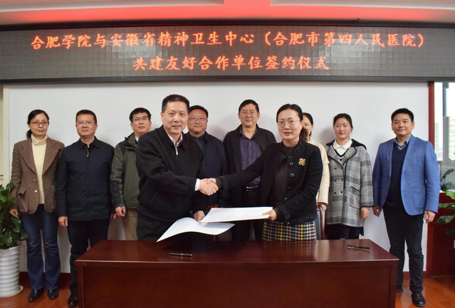 为加强医校合作共建,进一步推进学校心理健康教育工作,11月29日下午,我校与安徽省精神卫生中心(合肥市第四人民医院)签订了共建友好合作单位战略协议。我校党委副书记刘建中,合肥市第四人民医院副院长罗蓓蓓,主任医师、名医工作室负责人季益富,合肥市精神卫生防治中心副主任徐小童等出席签约仪式,校党政办、宣传部、学生处、教育学院等相关单位负责人参加仪式。
