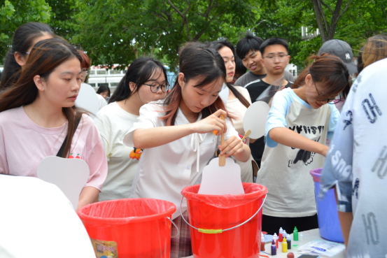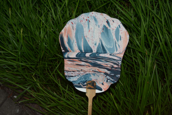在志愿者的指导下,同学们倾心制作一把属于自己的独特的漆扇。首先是调色,将调好的漆滴入水中并轻轻搅开。然后是上色,把扇子垂直浸入颜料中,入水时可左右摇晃或者轻微旋转,可使纹路多变。最后是晾晒,将扇子垂直拎出,并晾干。漆扇的制作过程融入了传统的大漆工艺与现代的创作元素,每一把漆扇都是独一无二的,展现了制作者的独特构思和对美的追求。