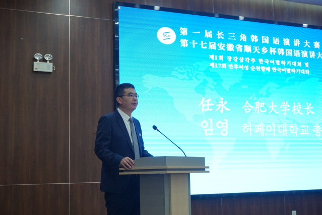 任永在致辞中表示,在学校开启高水平应用型大学建设新征程之际,迎来此次大赛意义非凡。自2008 年起,我校连续承办了十七届安徽省“顺天乡杯”韩国语大赛,为中韩教育交流和韩国语人才培养发挥了重要作用。今年的韩国语大赛扩展为长三角韩国语演讲大赛,有助于长三角三省一市实现韩国语教育资源的共享与韩国语人才培养的共赢。