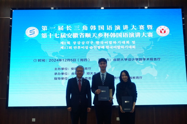 12月5日,第一届长三角韩国语演讲大赛暨第十七届安徽省“顺天乡杯”韩国语演讲大赛决赛在我校55栋学术报告厅成功举办。校长任永、顺天乡大学副校长金龙夏和省教育厅外事处处长姚德勇等出席开幕式,副校长陈秀出席颁奖典礼。