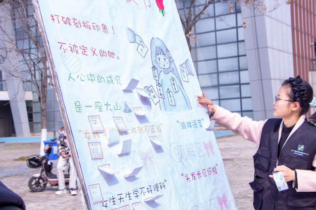 活动当天,工作人员提前做好准备,将活动现场精心布置,吸引了众多师生驻足参与。活动利用展牌展示了当今社会中对女性的一些偏见和观念束缚。参与者们通过在便签上书写自己的想法并贴到展牌上,表达对自我的认同与支持。这种互动形式不仅让参与者们得到温暖和鼓励,也为在场的每一个人带来了力量。此外,活动现场还准备了丰富的文创礼品,进一步激发了师生们的参与热情。文创礼品与活动主题紧密结合,成为传播活动理念的载体,吸引了更多人关注女性权益与多元价值。