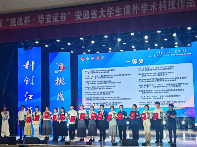 6月10日至12日,由团省委、省教育厅、省社科院、省科协、省学联联合主办的第十一届“挑战杯·华安证券”安徽省大学生课外学术科技作品竞赛省级决赛在安徽财经大学举办。我校学生作品荣获省级一等奖1个,二等奖8个,三等奖7个,同时学校获优秀组织奖。