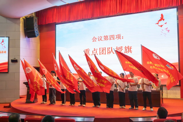 在热烈的氛围中,与会领导为18支校级重点团队授旗,为西部计划志愿者们颁发纪念品。