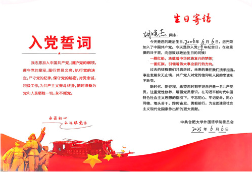 一人过生日,集体受教育。6月24日,外国语学院为入党时间在6至7月的师生党员过集体“政治生日”。院党委书记吴孔宝为2位教师党员和14位学生党员送上“政治生日”贺卡,帮党员佩戴党员徽章,并开展谈心谈话,引导党员坚定信仰、严守纪律、永葆初心、砥砺前行。