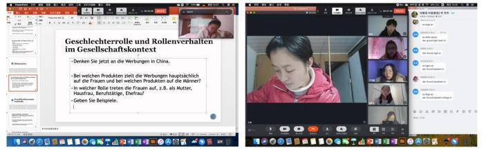 课堂上,我坚持不唱独角戏、要做团体操的原则,积极开展线上互动,学生参与感强,课堂氛围轻松融洽,并实时反馈和解答问题。《中级德语 2》平均每节课互动次数上百,我通过多层次输入,从语言层面的词句篇章的表达到内容结构与意义的讲解,再到社会文化的背景结合与主题补充,提供相关音频、视频资源,充分调动学生课堂参与的积极性和语言产出的热情,将问题和思考融入班级互动,依据课程难度,采取翻转课堂的形式,组织班级结成学习小组,充分发挥学生的创造力和团队合作能力。课后,利用腾讯会议,展开一周班会,收集学生线上学习效果反馈,及时备案与调整。