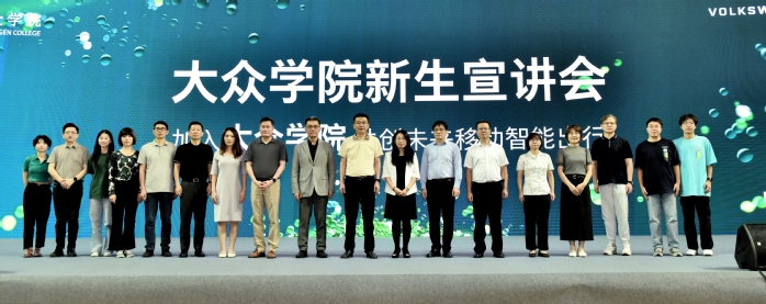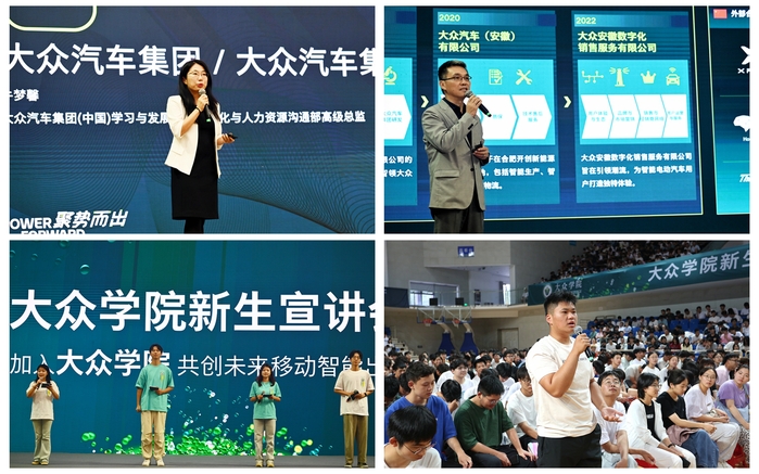 大众学院相关负责人介绍了大众学院概况、新生选拔机制和人才培养方向,并对新生的疑问逐一作出了解答。牛梦馨介绍了大众汽车的品牌实力、研发中心、企业文化,大众智能电动汽车中心首席人力资源官邵剑介绍了大众汽车在安徽的发展历程以及远景规划。学生代表陈政扬、王诚信、邹炎晖分享了学习和成长的故事,校友何振扬分享了在大众汽车(安徽)的实习工作经历及发展现状。