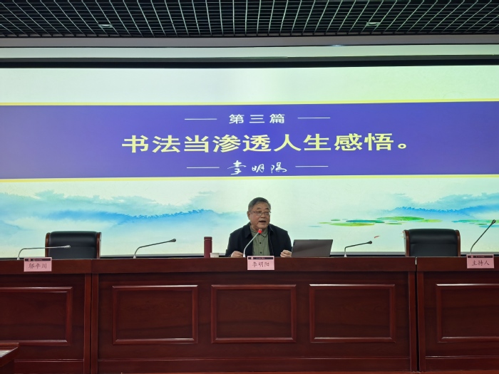 李明阳围绕书法的核心价值与美学品格,结合自身生活实际分享美学感悟,从书法学习、创作、书法艺术的文化传承、创新,书法创作中的品德涵养与和谐之美,多种艺术形式的交融共生等多个维度娓娓道来,既有艺术的美感,更有生活的温度。报告会上,现场师生围绕“书法如何融入日常生活”“如何传播书法文化”等话题,积极开展互动交流。