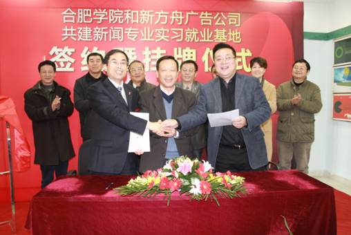 2011年12月16日上午,合肥学院副院长陈啸率队亲赴合肥新方舟广告公司,正式签署实习就业基地协议并挂牌。教务处处长邵一江、服务地方与合作交流办公室主任董强、学生处学贷中心办公室主任詹磊以及中文系主任詹向红、总支书记周运良、新闻学教研室主任黄海波等随同参加签约挂牌仪式。