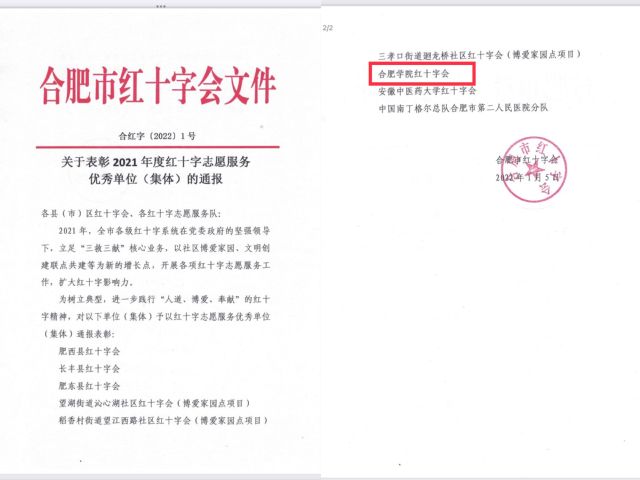 近日,《关于表彰2021年度红十字会志愿服务优秀单位(集体)的通报》(合红字[2022]1号)公布了获奖单位名单,这是继我校大学生红十字会荣获合肥市“无偿献血高校优秀志愿者社团”称号之后再次荣获表彰。