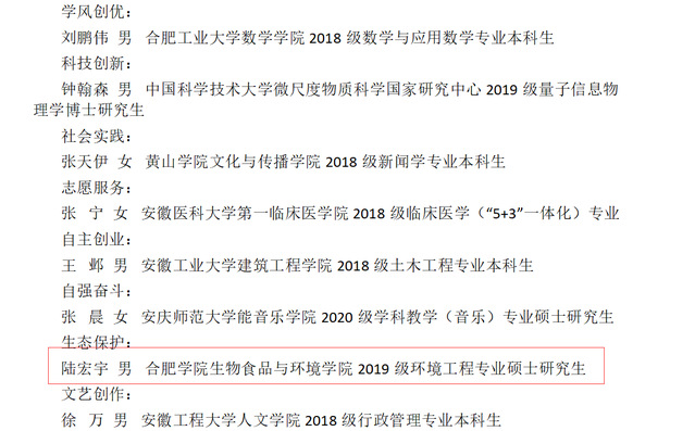 近日,2021年安徽省“十佳百优大学生”评选结果公示,我校生物食品与环境学院2019级环境工程专业研究生陆宏宇当选安徽省“十佳大学生”(生态保护类)。