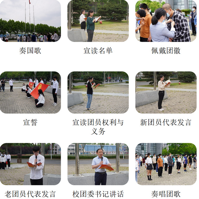 校团委老师丁婧宣读了《团章》中有关团员义务和权利的条款,提醒每位团员要明确自己肩负的责任,切实履行团员的义务;新团员代表周欢在发言时难掩心中的激动,她提到戴在左胸前的团徽,它不是一个普通的装饰品,也不是一般的纪念章,而是共青团员身份的象征,是一个光荣的标志。老团员代表杨子墨向新团员们表达了欢迎和祝贺,并鼓励他们要以优秀团员的标准严格要求自身,在各方面不断努力进步,为团组织增添光彩,并以此共勉。