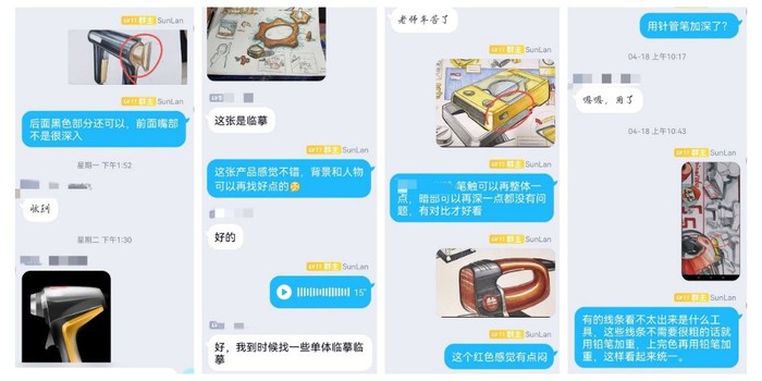 空间的阻隔让孙老师难以全面掌握学生的学习状态,更难以精准指导每位学生的手绘作业,为此,孙老师摸索出了“分组连线”的方法,每组四位同学,同时将手绘状态实时反映在师生的屏幕上,老师一一点评指导,各组随机轮换连线,这样老师就能及时发现每位学生的问题并加以辅导。这种新颖的线上教学方式对于孙岚来说已经不是第一次尝试了。“在2020年的特殊时期,我就已经在尝试使用这种线上教学方式,当时同学们的反响较好,所以在这次线上教学中,我沿用了这种方式。”孙老师说道。因为课程少、任务重,为监督学生的学习状态,提高学生课内外的学习效率,孙老师还建立了课后学习小组,通过线上软件对学生进行详细指导,结合课后练习帮助他们及时巩固课堂知识。这一套“组合拳”下来,不仅提高了学生在线上课堂中的积极性,也保证了线上教学的质量。