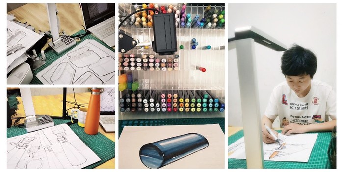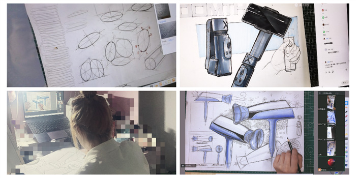 《手绘产品效果图》是工业设计、产品设计专业重要的实践类专业基础课,讲究的是“真操实干”。“由于设计专业的特殊性,大多学生的手绘基础薄弱,为了保证教学质量,所以我们的手绘实践课即使是在线上进行也要让学生们真正动起手。”设计学院的孙岚老师说道。为了达到实质等效的线上教学效果,孙老师创新教学手段和教学方法,借助腾讯会议和QQ两个平台,搭建了“电脑+实物投影仪+录播灯”的简易录播室。线上教学时,孙老师的示范讲解实时反映在学生的屏幕上,学生可以跟着老师边学边练。