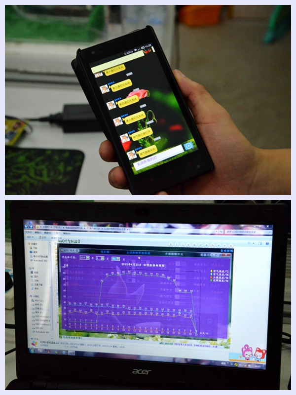 红枫叶智能温室不仅控制技术“高大上”,就连控制模式也很“亲民”,电脑端和手机端均可采用“聊天”的方式进行,系统收到指令后自动运行。采访中,我们得知,来自网络工程专业的他们研究的这个项目并非“专业对口”,但因为有兴趣,一路秉承“坚挺精神”,研究的动力十足,不少专业技术都是自学而成。小组成员吴崇波主要负责比赛录制视频及后期视频处理工作,黄雪茹和牛晓芙负责写文档,整理材料。大家平时一有时间就来实验室,暑期也一直留在学校一门心思地研究温室。“不用督促,学生是自己喜欢,他们每天早早的就来实验室研究,晚上直到宿舍关门前才不舍地回到宿舍。”指导老师周艳玲介绍到。虽然整日泡在实验室里,但因为兴趣所致,团队里总是充满着快乐的氛围。他们还给系统起了可爱、新颖,略带幽默感的名字——“小蜜蜂”,每次和“小蜜蜂”的成功“聊天”都是对他们程序设计、运作的肯定。