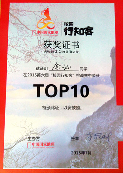 《中国国家地理》第六届“校园行知客”挑战赛于今年4月启动,本次比赛以“为爱远征”为主题,以贵州、湖南、青海、西藏等十个省为目的地赛区,倡导进行有深度有意义的行走,在认识中国、记录中国的路上寻找发现创造爱。我校2013研究生金沁同学以《站站乐——用铁轨丈量贵州》的旅行计划参加此次比赛,并从全国近3000名报名选手中经层层选拔,以30强身份进入复赛,在重庆金佛山的复赛过程中通过户外拓展、徒步、露营、主题表演、梦想答辩等考察环节,充分展示了个人性格、沟通能力、面对陌生环境的适应能力等综合素质最终入围本届“校园行知客”挑战赛TOP10,并获得旅行基金和装备。