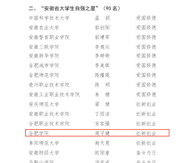 为传承红色基因、进一步用身边的榜样力量引领广大同学不断坚定理想,鼓励新时代青年以青春之我践行强国有我青春宣言,团省委、省学联组织开展了2021年度大学生自强之星评选活动。经学校推选、组委会组织专家评审,我校人工智能与大数据学院2019级网络工程专业周子健同学荣获安徽省大学生自强之星(创新创业类)称号。全省高校范围内共评选出100安徽省大学生自强之星获得者。