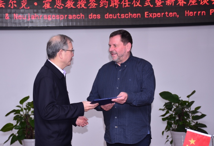 2月10日上午,我校在行政楼九楼东会议室举办外籍教授聘任仪式暨新春座谈会,来自德国汉诺威应用科学大学的法尔克·霍恩受聘为学校外籍教授。党委书记王其东、院长吴春梅出席仪式,组织部、教务处、人事处、国际交流合作处、研究生处、设计学院、外国语学院等相关单位负责人参加仪式。王其东给霍恩教授颁发聘书,人事处处长纪平代表学校与霍恩教授签订聘任协议。