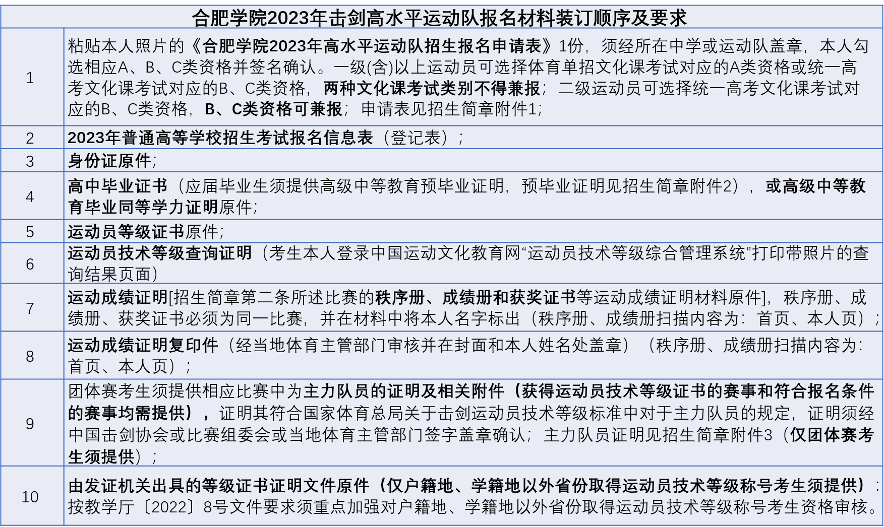符合我校报名条件的所有考生,须提供按以下材料清单提供原件,同时将原件扫描后按目录顺序编号制成1个PDF文档,并命名为“生源省份+运动员姓名+统一高考考生号+合肥学院击剑高水平运动队报名材料”(例:安徽省张**2334***合肥学院击剑高水平运动队报名材料):