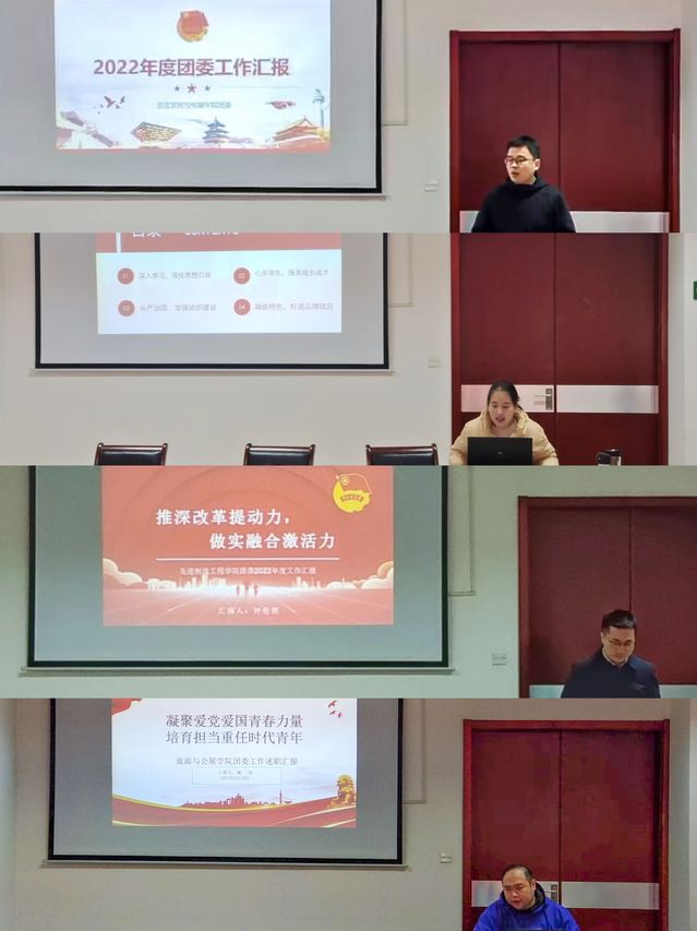 11个学院团委负责人现场述职,结合年度重点任务和工作目标,围绕引领力、组织力、服务力和贡献度四个方面展开汇报,总结成绩、凝练品牌、反思不足,交流了今后的工作思路和改进措施。各学院团委坚持从严治团和深化改革,2022年度工作特点鲜明。人工智能与大数据学院通过举办“萌新杯”、大数据与人工智能应用、数独深度游等科技类竞赛以赛促学,以赛提能;外国语学院发挥多语言教学优势,开展外语类话剧、演讲、诵读大赛激发大学生学习热情;能源材料与化工学院聚焦学院党建带头和共青团优势,坚持党团共建服务学生;经济与管理学院持续夯实基层团支部建设,选树优秀典型,发挥榜样引领作用;教育学院积极打造电子课件设计大赛、特色短剧等师范生品牌活动;城市建设与交通学院紧扣“做青年学生的贴心人”为师生办实事,提升共青团服务力;生物食品与环境学院统筹学科、社团资源,搭建创新创业联动平台;语言文化与传媒学院以“红色经典诵读大会”等主题教育活动为载体,凝聚青年理想信念;先进制造工程学院着力打造网络媒体平台,宣传教育工作提质提量,社会实践成效显著,暑期“三下乡”实践活动受到合肥晚报、安徽卫视等媒体报道;旅游与会展学院不断提升实践育人成效,协助安徽省肿瘤防治所开展三个“防癌”主题系列活动;设计学院为山区设计农产品包装和文化导览图,将专业特长与助农助民结合,助力乡村振兴。