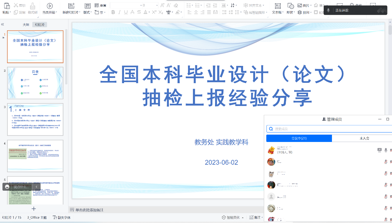 6月2日,我校2023年教学管理人员系列培训会议(毕业设计(论文)抽检上报工作专题)通过腾讯会议平台,于线上举行。各教学单位教学办主任、教务员参加会议。