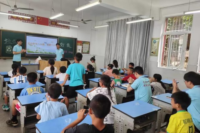 在安徽省石台县大演乡中心小学,团队成员们围绕“垃圾分类”、“国家公园建设深入乡村”、“保护生物多样性,建设环保湿地公园”等主题开展校园宣讲活动。团队成员们通过讲述绿色环保故事,带领孩子们学习垃圾分类的相关知识,引导孩子树立节约、环保的绿色生活理念。