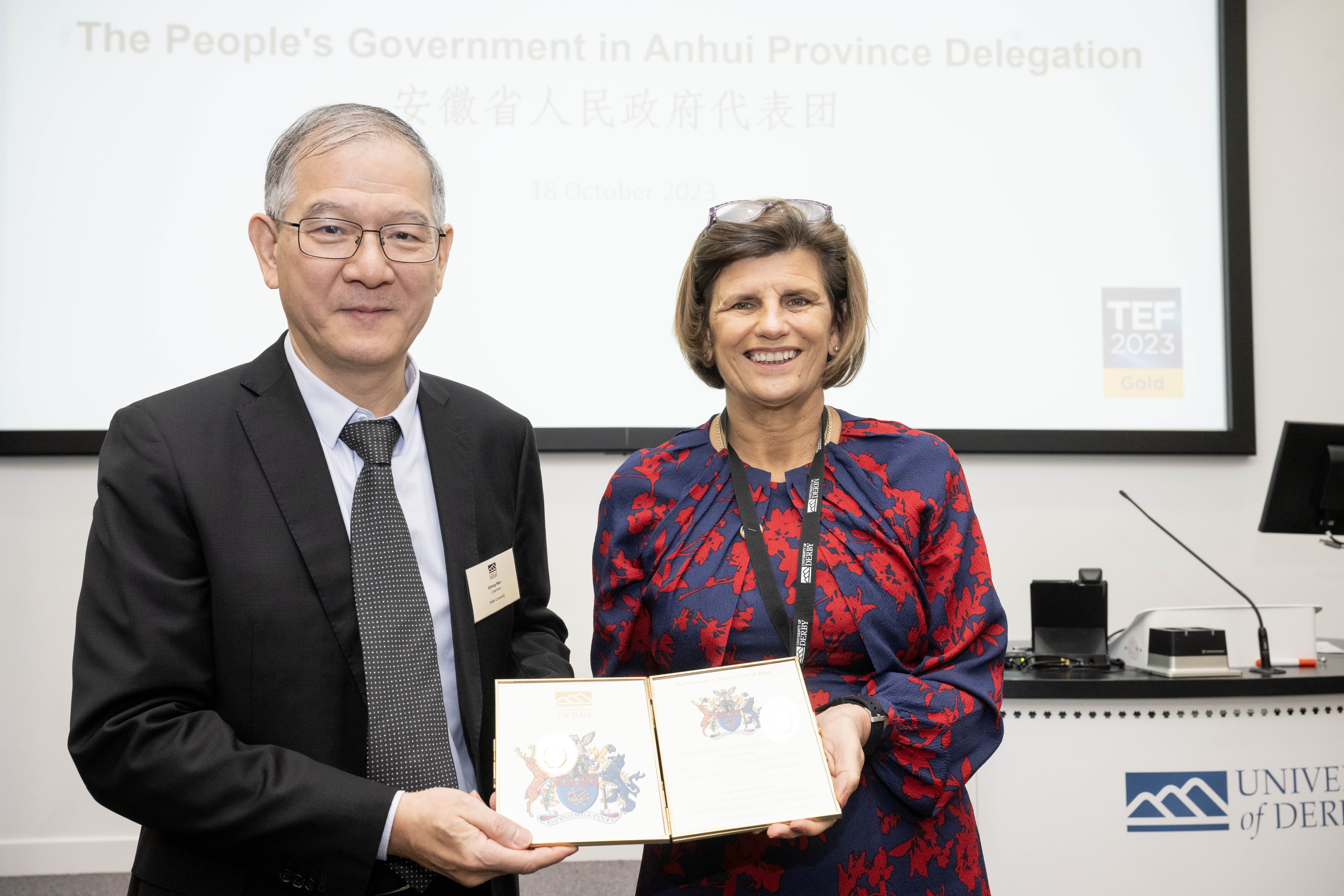 1018日,在王清宪省长、中国驻曼彻斯特领事馆总领事唐锐、英国德比郡议长代表托尼·金(Tony King)及安徽省政府代表团的见证下,王其东代表学校与德比大学校长凯西·米切尔(Kathryn Mitchell)签署了校际合作框架协议,开展师生互访、学生培养、科研合作等。