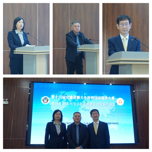 1123日,由安徽省教育厅主办、合肥学院和韩国顺天乡大学承办的第十六届安徽省顺天乡杯韩国语演讲大赛在我校成功举办。安徽省教育厅外事处处长姚德勇、校长吴春梅和顺天乡大学副校长金淳在开幕式上致辞,顺天乡大学柳炳旭、金仁荣和林丽明三位教授担任大赛评委