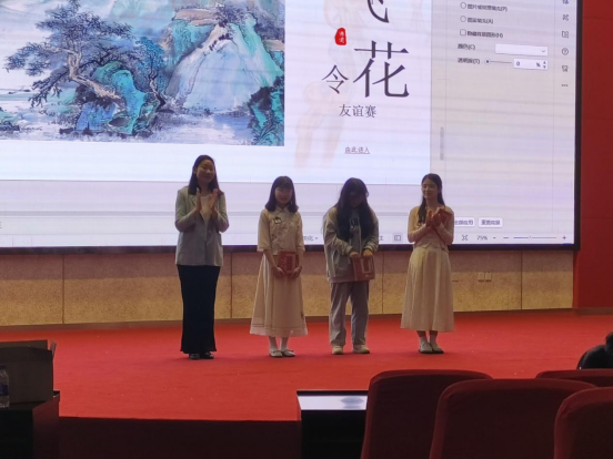 最后的友谊赛环节为“飞花令”,24位选手根据他们所抽到的数字重新组成新的4支队伍,共同展开接下来的比赛。比赛过程紧张而激烈,选手们睿智从容、淡定自若,出口成章、佳句迭出,应答自如、精彩不断。四支队伍两两交锋、角逐冠军,选手们你来我往、互不相让,现场掌声不断,气氛热烈。