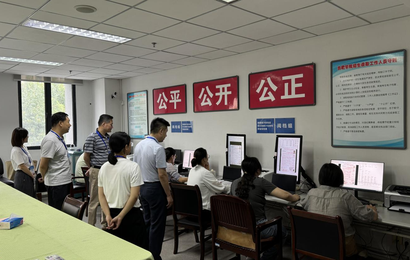 七月盛夏,我校2024年高招录取工作紧张有序进行中。录取期间,安徽省教育招生考试院副院长张英明、校党委书记王其东、副校长陈秀先后深入我校普通本科招生录取现场,亲切慰问奋战在一线的工作人员,对招生录取工作进行指导与检查。校党委委员、教务处处长(招生办公室主任)王晓峰代表全体招生录取工作人员对各位领导的慰问探访表示感谢,并就2024年学校普通本科招生录取进度进行阶段性工作汇报。